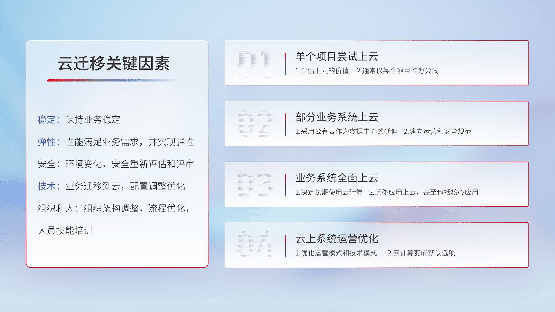 结合实际业务,,,,从规划设计、、、、云平台选型、、、云原生改造、、数据迁移、、集成交付,,迁移全过程为客户识别最佳上云路径,,,,做好风险识别管理,,,,设计网络架构、、、、身份权限、、安全审计合规、、、操作审计、、、、日志审计、、监控告警策略、、、多站点容灾设计等,,,,对云上基础设施进行整体规划,,,提升IT治理水平,,以满足弹性、、、、高可用、、高性能的需求。。