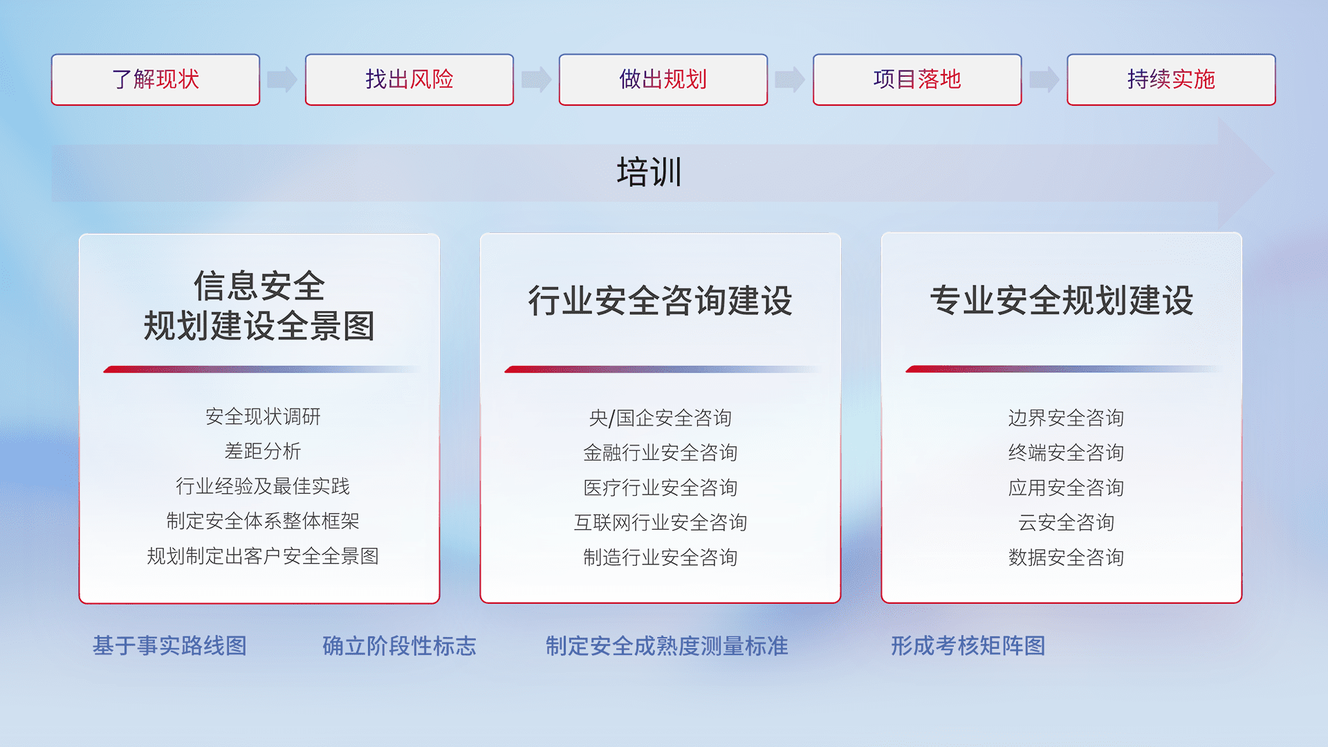 梳理客户信息安全现状调研、、、差距分析结果,,结合行业先进经验及最佳实践,,制订客户的信息安全管控体系总结架构,,最终形成一个完整的客户信息安全规划与建设的全景图。。